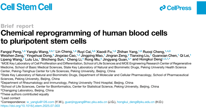 2025年7月30日,北京大学基础医学院邓宏魁课题组与北京大学药学院关景洋课题组合作,在国际学术期刊CellStemCell上发表了题为“ChemicalReprogrammingofHumanBloodCellstoPluripotentStemCells”的最新研究成果。该研究首次实现了利用化学方法将人血液细胞诱导为多能干细胞,克服了化学诱导多能干细胞制备中起始细胞来源的关键瓶颈,将进一步推动化学诱导多能干细胞技术的可及性。