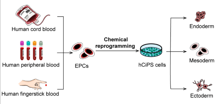 皮肤成纤维细胞和脂肪基质细胞虽为常用来源,但其他类型的体细胞——特别是人类血细胞——能否通过化学重编程成功转化为hCiPS细胞,此前仍是未知数。与其它体细胞类型相比,血液细胞是最易获取、最便捷且近乎无限的组织来源。采血程序成熟、不易污染且对患者和捐献者侵入性小。更重要的是,血库中储存着大量可用于研究和应用的冻存血液样本。因此,开发一种能够从血液细胞稳定、高效制备hCiPS细胞的化学重编程策略具有重要的意义,这将克服现有化学重编程技术的局限,促进其在个体化再生医学中的广泛应用。